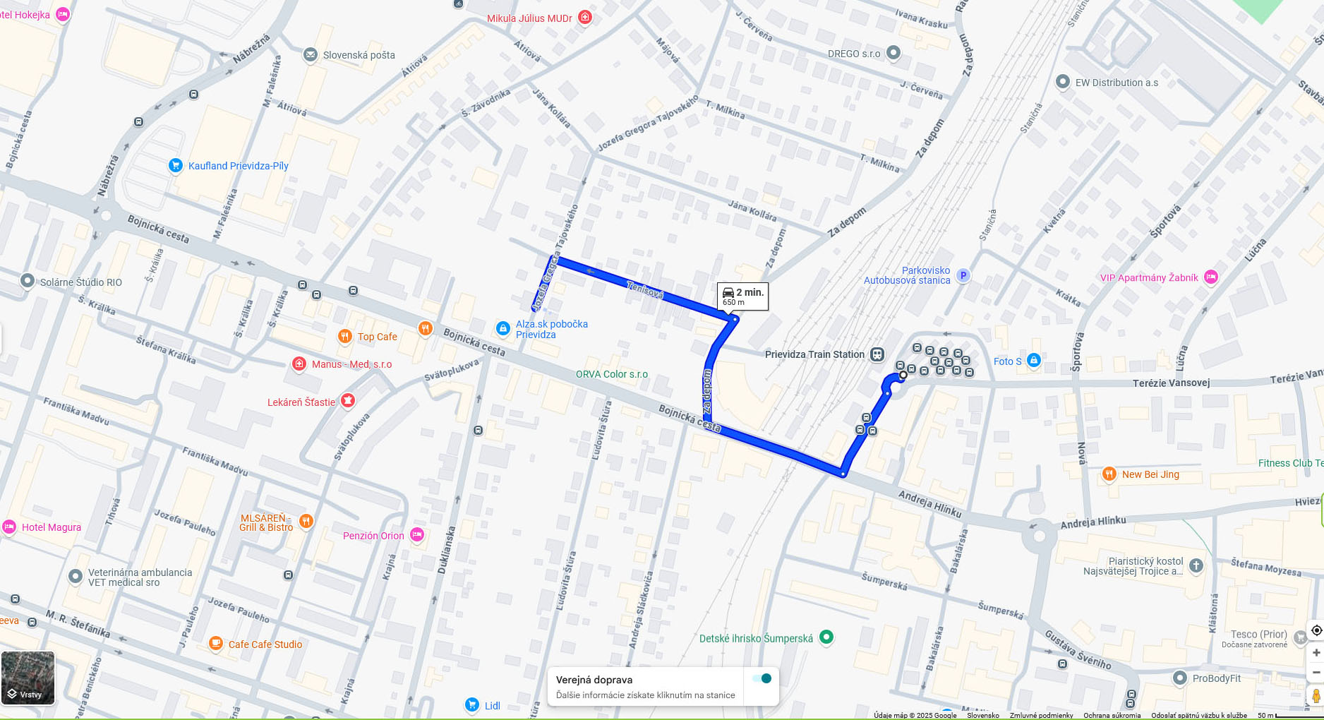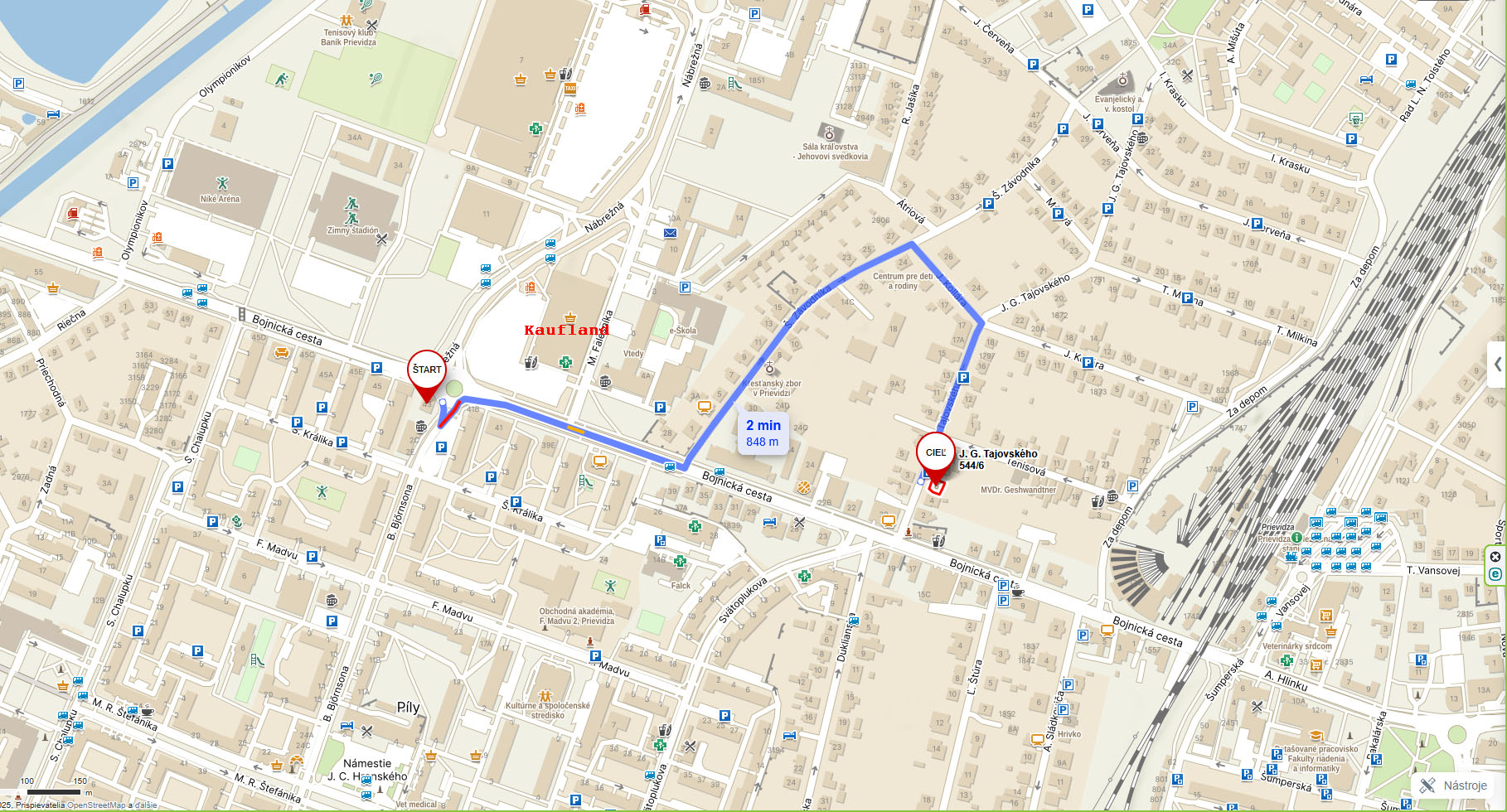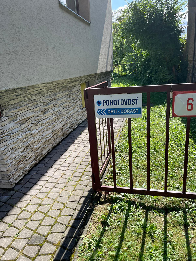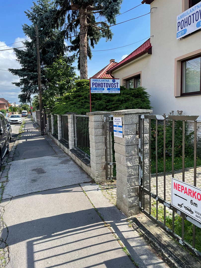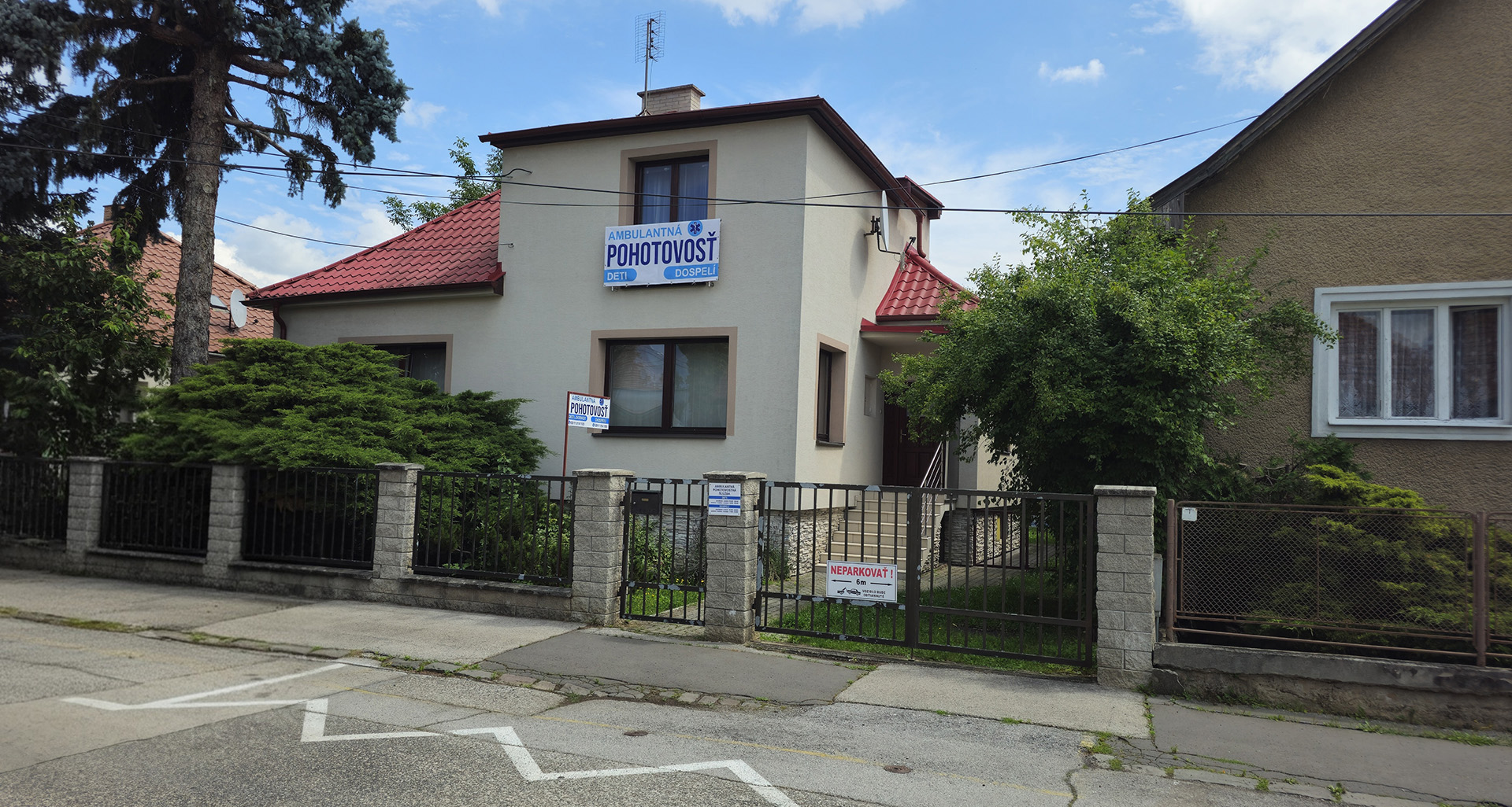 Zo smeru od Bojníc (napr.od kruhového objazdu pri Kauflande) po Bojnickej ceste sa odbočí pred budovou bývalej pošty doľava do ul. Š.Závodníka, následne po 300 m doprava na ul.Jána Kollára a potom po 100 m znovu doprava na ul. JG Tajovského - po 160 m vľavo je budova pohotovosti. Na ľavej strane sú bezplatné parkovacie miesta.